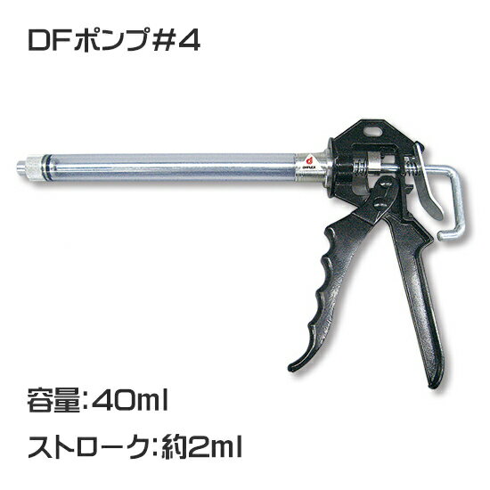 注入用 DFポンプ #4 グラウト工法でグラウトプラグAなど自動式低圧注入プラグに樹脂を注入するポンプです。 シリンダーが透明で目視で内容(残量・エアー巻込み)が確認できます。 ピストンロッドに4等分の目盛りがあり、材料の吸込み・注入量の管理に便利です。 ■注入用 DFポンプ #4 ●容 量:40ml ●注入量:約2ml/ストローク ●ピストンロッド1目盛目安:約10ml ●シリンダー材質:塩ビ製