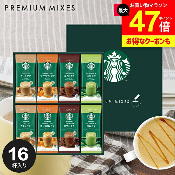 ●商品名/STARBUCKS プレミアム ミックス SBP-30B●商品内容/カフェラテ×4袋、キャラメルラテ×4袋、カフェモカ×4袋、抹茶ラテ×4袋●箱サイズ/約303×273×35mm●賞味期限/別途商品ラベルに記載(賞味期限が近いものは出荷いたしません。ご安心下さい。)スターバックスの人気ラテ系メニューをご自宅で簡単に楽しめるプレミアムミックスシリーズです。厳選した100%アラビカ豆のコーヒーと全脂粉乳を使用し、ミルクリッチな味わいを実現。スティックタイプの個包装ですぐにご自宅でお店の味が楽しめます。※商品リニューアル等で予告なく商品内容・パッケージ等が変更になる場合がございます。