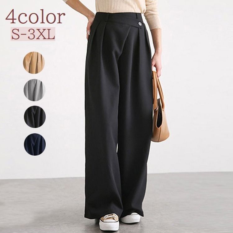 送料無料 ロングパンツ ワイドパンツ レディース 女性用 ボトムス 長ズボン 無地 シンプル 単色 ボタン おしゃれ ゆったり カジュアル きれいめ クール オフィス 通勤 普段使い お出かけ 大きいサイズあり 体型カバー 婦人用