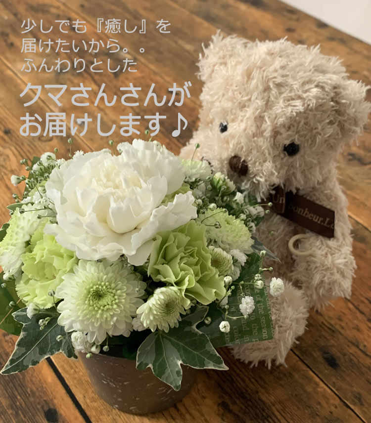 供花*お供えのフラワーアレンジメント └色指定のある場合お待たせする場合もございます ※夏季はクール便のみになります 内容 くまのぬいぐるみ フラワーアレンジ アレンジ材料 ・季節の花 ※仕入れにより多少変わります 花の色 選択肢よりお選びください。 くまの色 選択肢よりお選びください。 花のサイズ 幅10cm×奥行き10cm×高さ10cm ※多少のずれはご了承ください。 いっしょにお送りするもの ・メッセージカード (ご希望により) ・お取り扱い説明書 ※ギフト仕様でお送りしますので価格の分かるものは入れません こんな時に 供花 お供えの お子様 ワンちゃん 猫ちゃん 子供 ネコ 犬 ペット フラワーアレンジメント 供花 仏花 ご葬儀 法事 仏事 友人 フォーネラル お盆 新盆 お彼岸 命日 弔事 お悔やみ 枕花 くま ぬいぐるみ プレゼント 【楽ギフ_包装】【楽ギフ_のし宛書】【楽ギフ_のし】 【楽ギフ_メッセ】【楽ギフ_メッセ入力】供花*お供えのフラワーアレンジメント 供花 仏花 ご葬儀 法事 仏事 フォーネラル お盆 お彼岸 命日 弔事 お悔やみ 枕花