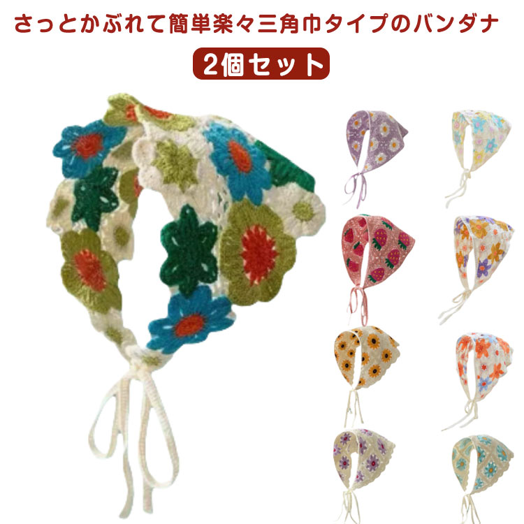 2枚セット!レース 三角形 韓国 バブーシュカ ヘッドアクセサリー レディース スカーフ おしゃれ かぎ針編み ヘアバンド カチューシャ 春夏 旅行 写真撮影 シンプル 花柄