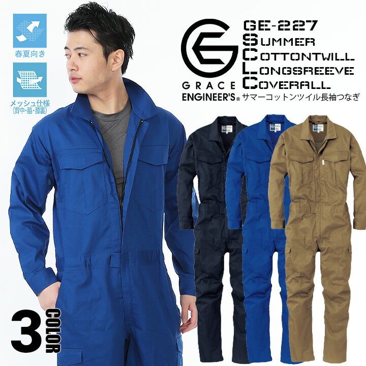 つなぎ 長袖 夏用つなぎ 作業服 作業着 春夏 【メッシュ仕様・綿100%】コットン ツイル 長袖つなぎ GE-227 グレースエンジニアーズ エスケープロダクト ツナギ ヒザ3Dカット 背中メッシュ 脇メッシュ 膝裏メッシュ クライミングカット 【S-3L】
