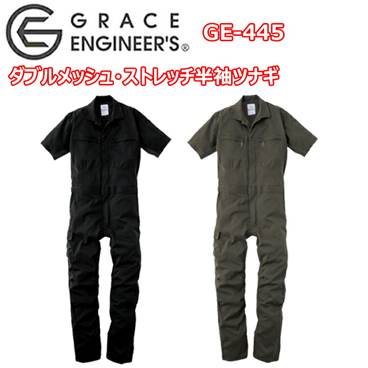エスケープロダクト GRACE ENGINEER'S GE-445 ダブルメッシュ・ストレッチ半袖ツナギ S-3L 小物収納ポケット ヒザ3Dカット 胸ファスナー付きポケット クライミングカット 通気性抜群なツナギ メンテナス作業 作業着 作業服 目玉