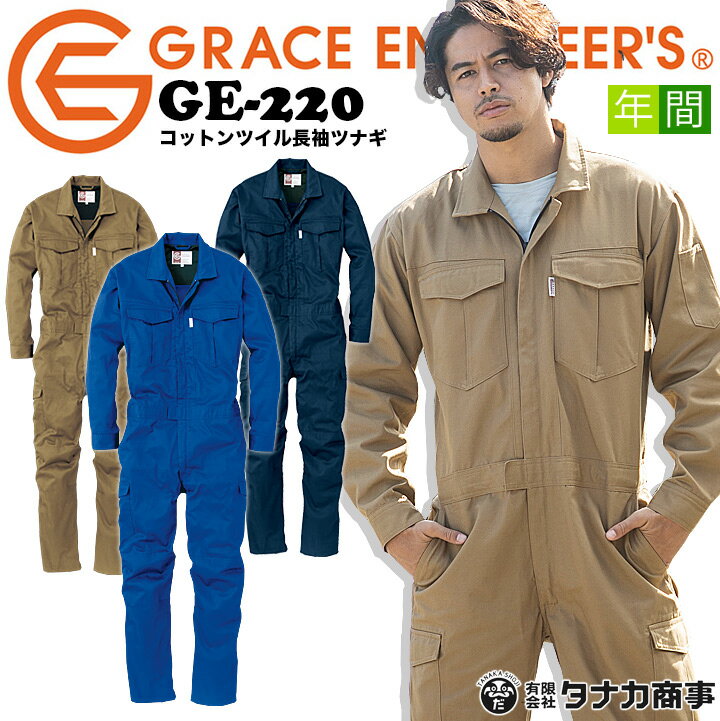 つなぎ 長袖 作業服 作業着 厚手 オールシーズン 【タフ素材・綿100%】 コットン ツイル 長袖つなぎ GE-220 グレースエンジニアーズ エスケープロダクト ツナギ ヒザ3Dカット クライミングカット【S-3L】