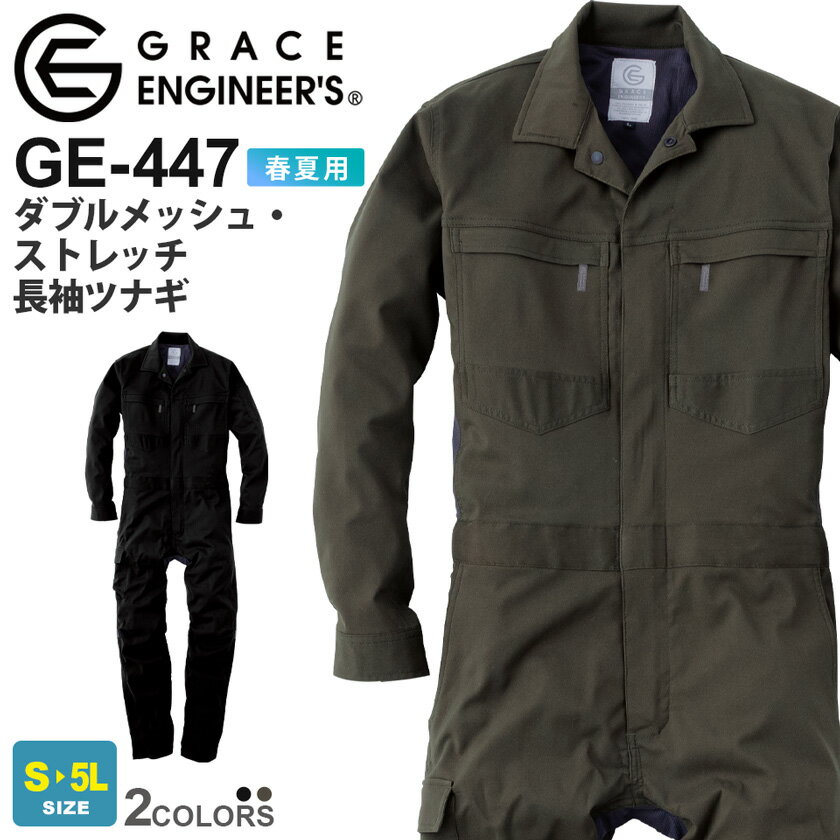 エスケープロダクト GRACE ENGINEER'S GE-447 ダブルメッシュ・ストレッチ長袖ツナギ S-3L ヒザ3Dカット 胸ファスナー付きポケット クライミングカット 通気性抜群なツナギ メンテナス作業 作業着 作業服 目玉