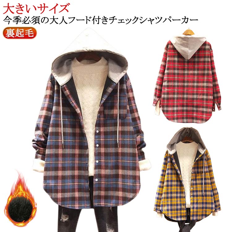 シャツパーカー フード付き ロングシャツ レディース アウター トップス 裏起毛 カジュアルシャツ 長袖 オーバーサイズ 秋服 冬物 ゆったり 体型カバー チェック柄 大きいサイズ おしゃれ 送料無料