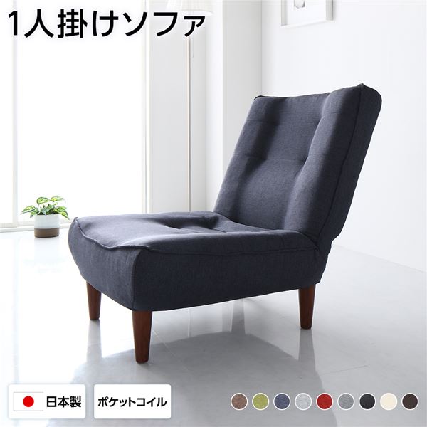■サイズ・色違い・関連商品シリーズ1人掛け+オットマン2人掛け+オットマン1人掛け2人掛けカラー・生地展開PVC生地・アイボリーPVC生地・ブラウンPVC生地・ブラックタスク生地・グリーンタスク生地・ブラウンタスク生地・ライトグレータスク生地・レッドデニム調生地・アッシュグレーデニム調生地・インディゴブルー■商品内容つつみこまれる、座り心地。リクライニング ハイバックソファ【リクライニングは3段階】リクライニングができるので、ちょっとしたお昼寝も可能。うとうとしたときにそのまま寝られるのは至福の時間です。【ハイバックでゆったりリラックス】首元まで背もたれのあるハイバック仕様なので、ゆったりとくつろげます。頭をソファにあずけられるとリラックス度がかなり違います。※身長によって届く高さは異なります。【しっかりした座り心地】高級マットレスに使用されるポケットコイルを使用しているため、弾力のある座り心地が楽しめます。ポケットコイルを使用することによって、ヘタりにくい、安定した座り心地が続きます。【安定した座り心地】しっかりとした座り心地は、人間の体の形を考えてくつろぎやすいように設計したもの。凹凸が体を包み込みます。【リクライニングとオットマンで極上のやすらぎ】オットマンと組み合わせれば、さらにゆったりとくつろげるスペースに。リクライニングで少し倒してオットマンを使えば、気分は飛行機のファーストクラスです。【信頼品質の日本製】品質が安心の日本製です。職人がぬかりなく、心を込めて作っています。日本製はやはり品格が違います。【取り外し可能な脚 脚を外せばフロアソファにも】お部屋を広く見せるロースタイル。座椅子感覚でゆっくりくつろげます。【お掃除もらくらく】足の長さが長いので、お掃除ロボットもスイスイ中に入っていきます。常にきれいな状態にしておきたい方にはぴったり。脚裏には床の傷つき防止のフェルトを貼っています。【選べる木脚】脚の色が2色から選べます。お部屋の雰囲気に合わせて、お好みでどうぞ。・ブラウン脚・ナチュラル脚【生地は3種類】■タスク生地さらりとした生地なのでオールシーズン使いやすいです・ブラウン・レッド・グレー・グリーン■デニム調生地デニム風でパリッとした高級感のある生地です。・インディゴブルー・アッシュグレー■PVC生地レザー調でかっこいい生地。汚れや水もはじくのでお手入れが楽です。・ブラック・ブラウン・アイボリー【替えカバーもあります】※別売となります。小さなお子様やペットのいるご家庭にうれしい、替えカバーもご用意。ソファの色に飽きたときの模様替えにもぴったりです。全3色・ベージュ・ブラウン・グリーン■商品スペック【商品サイズ(約)】1人掛けソファ:幅65cm×奥行78cm〜122cm×高さ82cm(座面高さ:30.5cm)オットマン:幅59cm×奥行49cm×高さ31.5cm※脚を取り付ける前の最フラット時寸法 1人掛けソファ:65×120×21cm オットマン:59×49×18cm【重量(約)】1人掛けソファ:11kgオットマン:4kg【材質】張地:ポリエステル100%中材:ウレタンフォーム構造材:スチールパイプ、ポケットコイルスプリング脚部:樹脂【梱包サイズ(約)】1人掛けソファ:64×46×66cmオットマン:45×16×66cm【製造国】日本製【配送について】本商品は、北海道・沖縄・離島への配送はいたしかねます。あらかじめご了承ください。【特記事項】・脚部のみお客様取り付け。・各サイズ・重量は概算になります。・製品のデザイン・仕様・梱包は予告なく変更することがございます。あらかじめご了承ください。・写真の色調はモニターの機種や設定により実際の商品と異なる場合があります。■送料・配送についての注意事項●本商品の出荷目安は【2 - 6営業日 ※土日・祝除く】となります。●お取り寄せ商品のため、稀にご注文入れ違い等により欠品・遅延となる場合がございます。●本商品は仕入元より配送となるため、北海道・沖縄・離島への配送はできません。