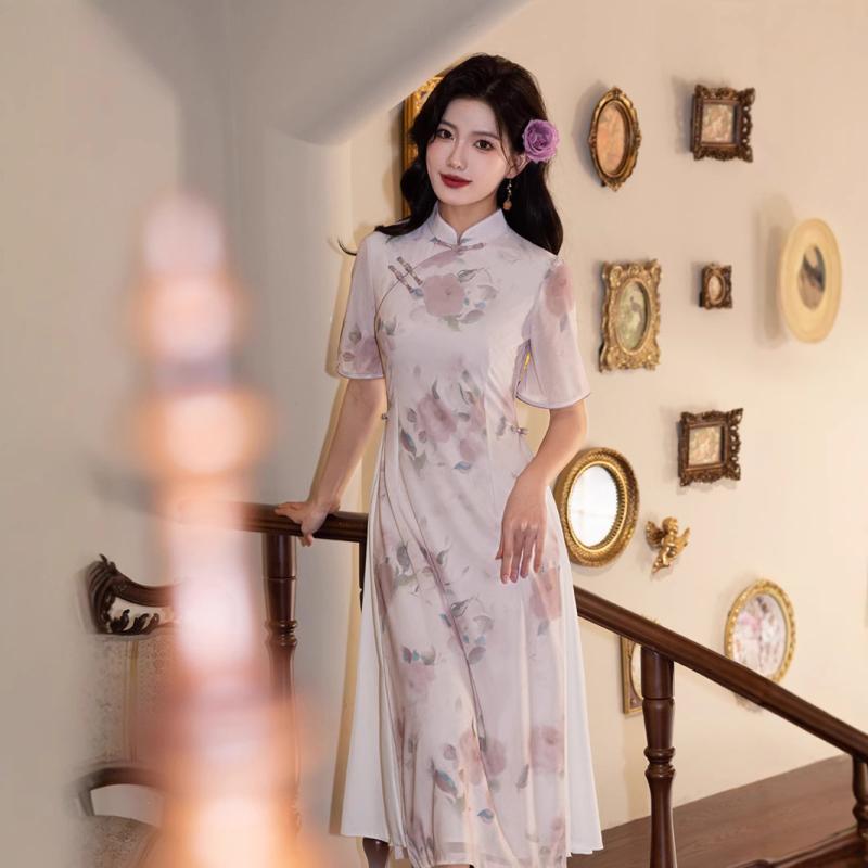 チャイナドレス レディース アオザイ風 レトロ クラシック 半袖 シフォン 花柄 タイダイ柄 ミドル丈 スリット スタンドカラー スリムフィット 体型カバー エレガント 上品 フォーマルドレス ポリエステル