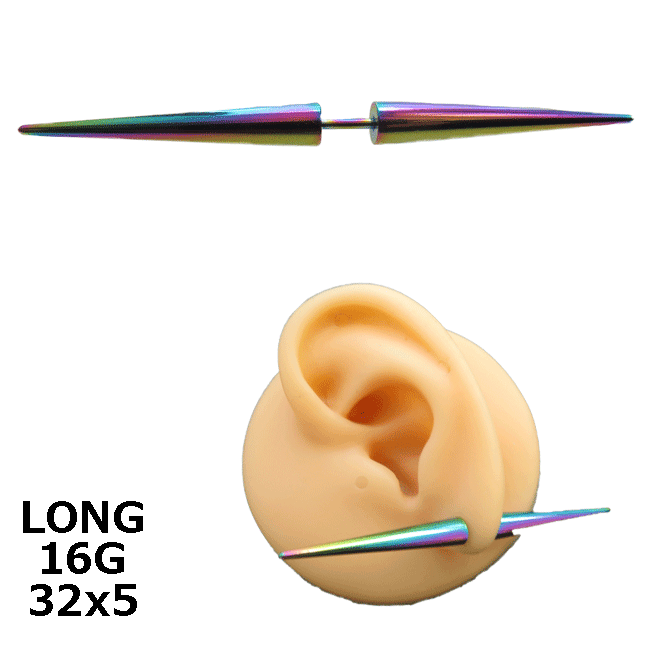 長めのスパイクがどこにつけても注目を集めること間違いなし耳たぶにフェイクプラグのように装着してもキマリますヘリックスのような耳の軟骨ピアスに突き刺すのもオススメコーディネートです【 注意事項】 ●サイズやカラーは、仕入れ時期の違いにより、多少の差異がございます。 注)この商品は一個売りの商品です。 破損・不良品・色違いなどにつきましては、直ちに良品と交換させていただきますので、お手数ではございますが、商品到着7日以内に弊社までご連絡ください。 □ 商品詳細 □ ●素材:ステンレス ●ゲージ:16G(約1.2mm) ●内径:約6mmロングスパイクバーベル フェイクプラグ 16g レインボーカラー (ボディピアス/ボディーピアス)