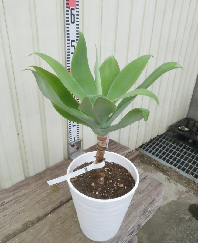 ※写真の商品をお送りします。 25年11月4日に入荷・撮影しました。 鉢を含めた高さは、約50cmです。 木の状態は季節によって変化いたします 2511aアガベ アテナータ 分類: キジカクシ科アガベ属 学名: Agave attenuata 原産: メキシコ東部 耐寒性 0℃ 最大樹高 1.5m アガベでは珍しく幹立ちする品種で最大150cmほどの幹を形成するようです。幅も最大150cmほどに成長する大型種です。 葉色がブルーグレーで葉が大きくなるとそり曲がり少し波打つ特徴があります。 アガベ アテナータ青葉種はしっかり日に当てて育てますが、"ボーチンブルー"(葉が青みがかった品種)や斑入り種は強い日差しは葉が痛むことがあるので、夏の強光線は避けるようにします。 日当たりが良く、風通しの良い場所が適しています。乾燥に非常に強い植物です。 アガベの中では寒さに弱く暖地では露地植えできますが、耐寒性は0度程度ですから寒い地域では冬は屋内に入れ、水は控えます。