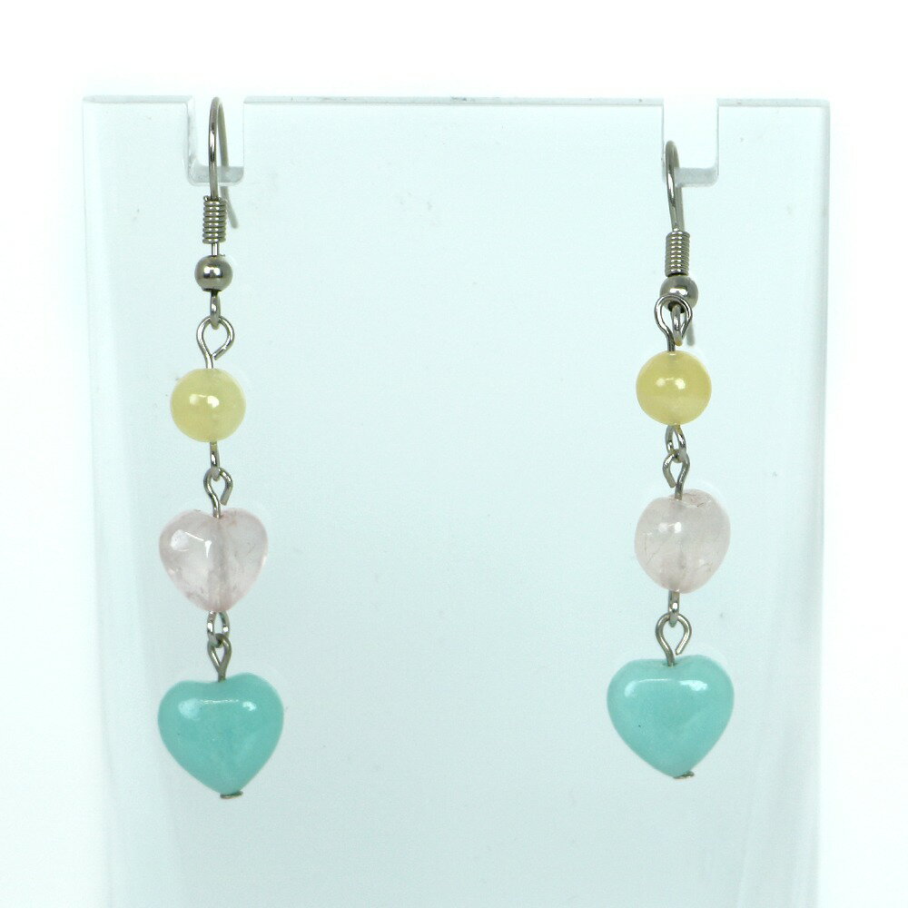 ハート:アマゾナイト直径(約)10mmハート:ローズクォーツ直径(約)8mm丸玉:イエロージェイド(約)6mm全長:(約)5cm 2つのハート天然石がついた『ツインハートピアス』です。大小2つのハート型の天然石がゆらゆらとてもキュートなピアスですよ♪ 【配送につきまして】 ●メール便:送料250円(お買い物合計金額3,000円以上で1通分送料無料) ・ヤマト運輸ネコポスでのお届けとなります ・宅配便同様のお届け日数(翌日〜3日程度での配達)*一部地域を除く ・ご自宅のポストへのお届けとなります(ご登録のお名前がポストへ記載があることをご確認お願い致します) ・大きさ(上限A4サイズ):縦31.2cm、横22.8cm、厚さ2.5cm、重さ1kg以内 ※後払い(商品到着後コンビニなどでのお支払い)はご利用頂けます ※代引き決済はできません ※配送日時指定不可 ※発送後の住所変更はできませんので予めご注意ください ※商品紛失などの補償は基本的にございません ●宅配便:送料は配達地域によって異なります(お買い物合計金額3,980円以上で送料無料) ・佐川急便でのお届けとなります ・ドライバーによる手渡しでのお届け ・代引き決済はドライバーへ代金のお支払が可能となります (代引き手数料330円) ・配送日時指定可能 ※初回お届けより1週間以上お受け取りになられない場合は持ち戻りとなり返送となります 返送による送料は運送会社の定価送料を実費ご負担いただくことになりますので 予めご注意くださいますようお願い申し上げます ※当店の判断で日本郵便(レターパック)で発送させていただく場合もございます 予めご了承のほどお願い申し上げます