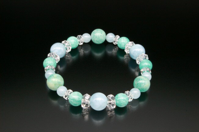 白水晶 6個(8×4mm/カット) 6個(6×3mm/カット) アクアマリン 3個(10mm珠) 6個(6mm珠) アマゾナイト 3個(10mm珠) 6個(8mm珠) [サイズ]約17cm(内周) [重量]約19g [中糸]ポリウレタンゴム [付属品]専用巾着袋、宝石パワーカード [生産国]日本 [個装サイズ]縦15.8×横10.0×高さ2.0(cm)/29(g) ※通常土日祝日を除く1週間以内に出荷の予定ですが欠品やメーカー終了の可能性もあり、 その場合は別途メールにてご連絡いたします「心身の平穏」「ポジティブ思考」「希望」 アマゾナイト 古来より「希望」や「行動」を象徴する石とされ、 夢や目標に向かって頑張ってはいるけれど迷いや障害があって、 なかなかうまくいかないという人に、進むべき道を示してくれるといわれています。 またイライラした気持ちを鎮める、 落ち込んだ気分を解消するなど心身のバランスを整えるパワーも持っているといわれ、 身につけている人をいろいろなマイナスエネルギーから守ってくれるそうです。 不安やイライラを鎮め 穏やかに毎日を過ごす 癒しのパワーストーン 「浄化」「願望成就」 白水晶 「癒し」「円満」「悪感情を洗い流す」 アクアマリン この石の名前は水を意味する「アクア」、海を意味する「マリン」に由来し、 母なる海のような愛と豊かさで「幸福」と「幸せな結婚」をもたらすといわれています。 淡いブルーの色が持ち主の不安や恐れを取り除き、安心感を与えてくれます。 また結婚パワーだけではなく、海のような癒しをもたらしてくれるため、 まわりの人に対してもやさしく、おだやかな気持ちで接することができるようになるなど コミュニケーション能力を高めてくれるともいわれています。 「宝石パワーカード」付き