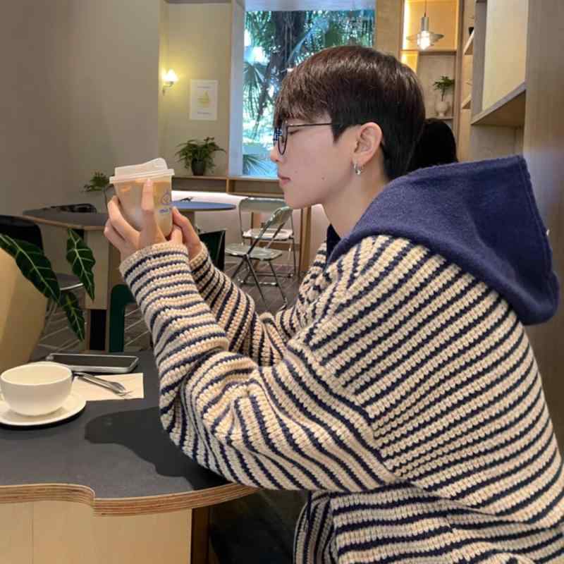 ニット メンズ ストライプ柄 パーカー 秋冬物 アメリカンレトロスタイル ゆったりサイズ プルオーバー トップス 綿混紡 普段使い 部屋着