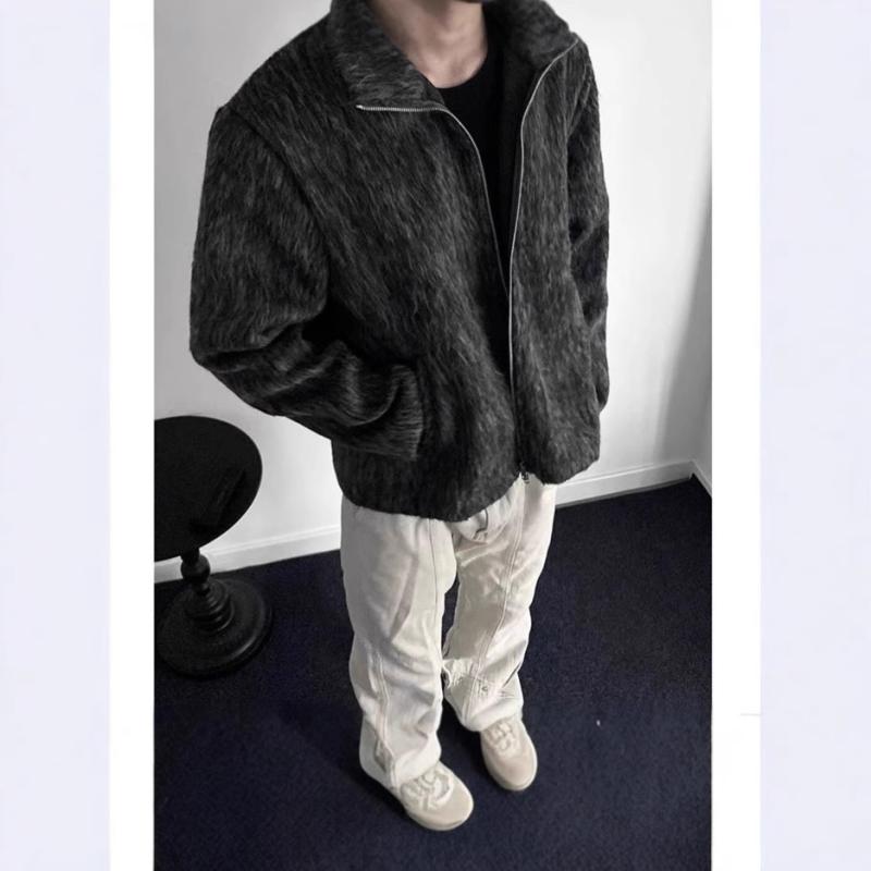 ジャケット メンズ 男性用 アメリカンレトロスタイル グレー 起毛 アウター ストリート ジップアップ スタンドカラー ウール混紡