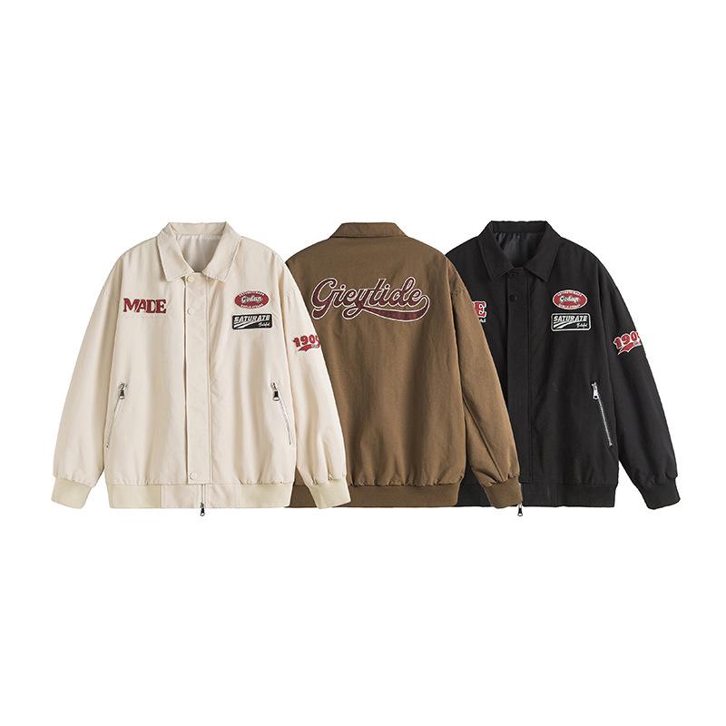 ジャケット 男性用 秋冬物 アメリカンレトロスタイル 刺繍 襟付き アウター 高 Street風 カジュアルトップス 黒 杏色 茶色 ポリエステル繊維
