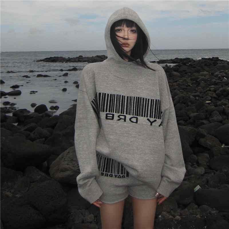 トップス ジャケット カジュアル アメリカン レトロ スタイル グレー レター フード付き スウェットシャツ レディース 秋冬 ハイウエスト スリム セーター ショーツ ツーピース セット