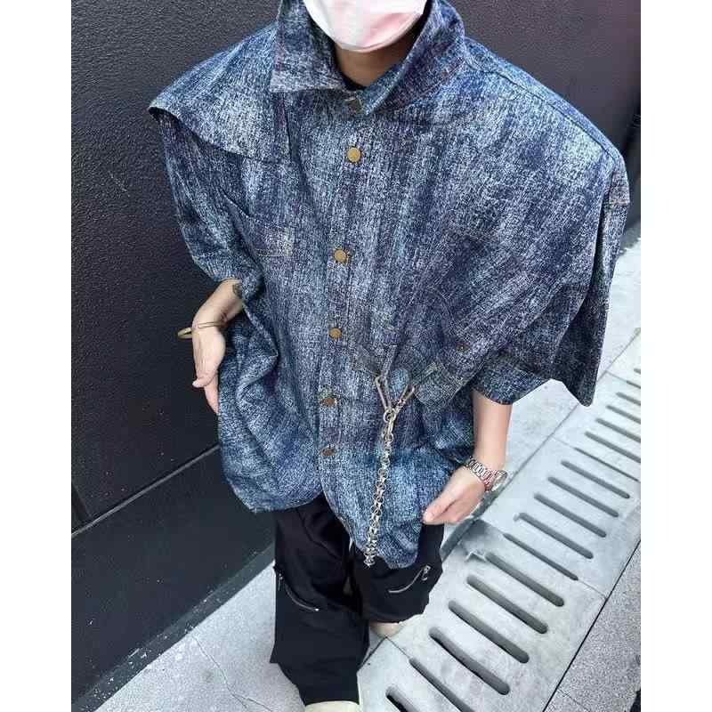 シャツ メンズ 半袖 デニム 絞り染め ウォッシュ加工 ヴィンテージ風加工 肩パッド アメリカンレトロ スタイル ポリエステル スリムフィット スクエアカラー ブルー 普段使い 春夏 アウター