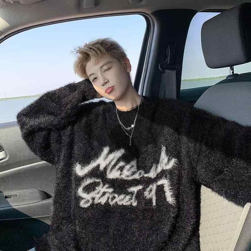 ニット メンズ セーター プルオーバー 丸首 リブ 裾 ポリエステル ゆったり ブラック 黒色 ジャカード アメリカン レトロ スタイル 普段使い