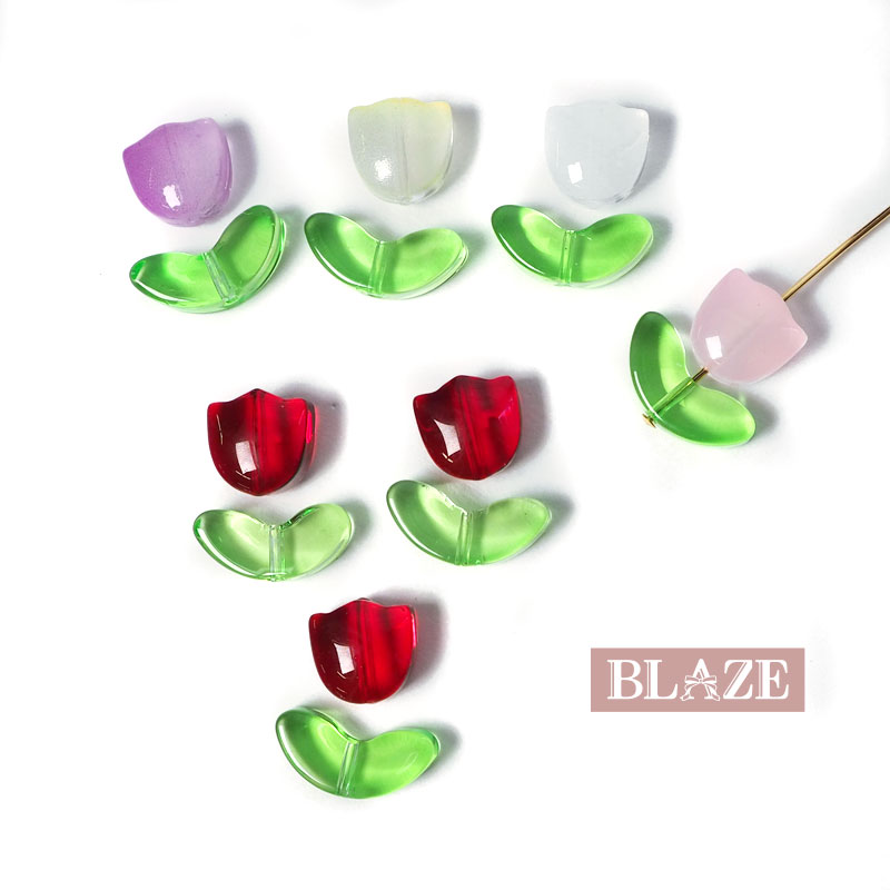 【3セット入り】ガラスビーズ チューリップ 全5色 全5色 BLAZE 商用利用可 花びら約9×9mm 葉っぱ約7×14mm アクセサリー パーツ 副資材 DIY 素材 材料 ハンドメイド クラフト 手芸 手作り 硝子 グラスビーズ かわいい 花 クリア ピンク レッド イエロー パープル