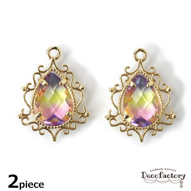 【チャーム】2個 イエロー×パープル ガラスしずく グラデーション チャーム アクセサリー 手芸 メタル パーツ 金具 アクセサリーパーツ ハンドメイド バイカラー エレガント ピアス イヤリング ネックレス