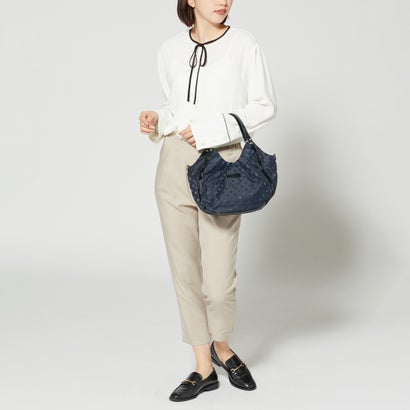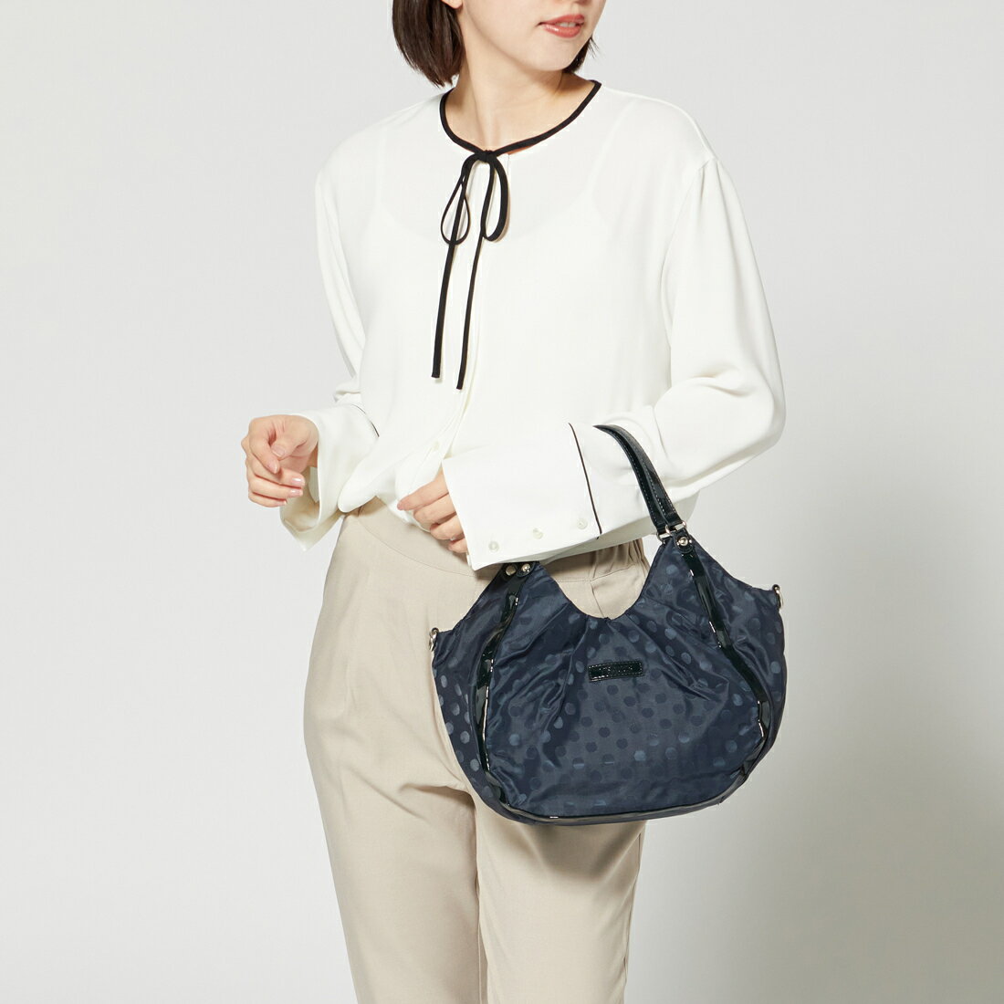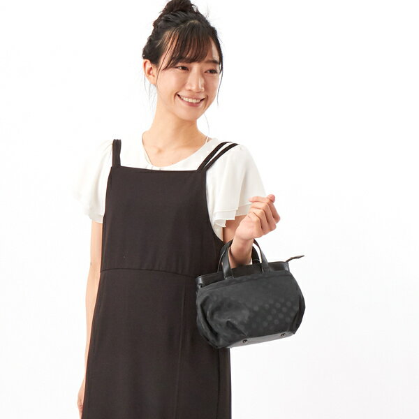 はっ水加工をほどこしたドット柄ジャガード生地を使用。メリヤス素材を裏貼りしたことで、柔らかく軽やかでさらっとした手触りに。上部にタックをほどこした、ふんわりと丸みのあるフォルムです。マチ部分にもタックを入れ、独特のフォルムになりました。部分的に用いたエナメル素材が、上品な印象。前後面とも、ハンドルからぐるりとエナメル素材をあしらい、柔らかな形をキープします。前後両面にマグネット付きアオリポケットを配しており、コンパクトなサイズ感ながら十分な収納力があります。前面のマグネット付きアオリポケットは、内側にオープンポケットを2個設けているので、スマートフォン(サイズにより異なります)やパスケースなど、さっと取り出したい物の収納に便利。取り外しのできるショルダーストラップ付きで、ショルダーバッグとしてもお使いいただける2way仕様。ハンドルは根元から倒すことができるため、置いた時やショルダーバッグとしてお使いの際に邪魔になりにくいつくりです。・A4対応(22×31cm):×・長財布(10×20cm):〇・ペットボトル横向き(500ml):〇・ペットボトル縦向き(500ml):〇こちらはアウトレット品です。主にはシーズン落ちの新品になりますが、中には細かな傷やシワ、若干の色落ち等がある場合がございます(訳あり品を除く)。FREE : 【重さ】380g / 【高さ】20-26cm / 【幅】34cm / 【底マチ】13cm / 【持ち手高さ】18cm / 【ショルダーストラップの長さ】75-127cm別カラーはこちら! ブラック ピンク ホワイト(アイボリー) ブルー グレー(ライトグレー) レッド ピンク(ライトピンク) グレー(ダークグレー)