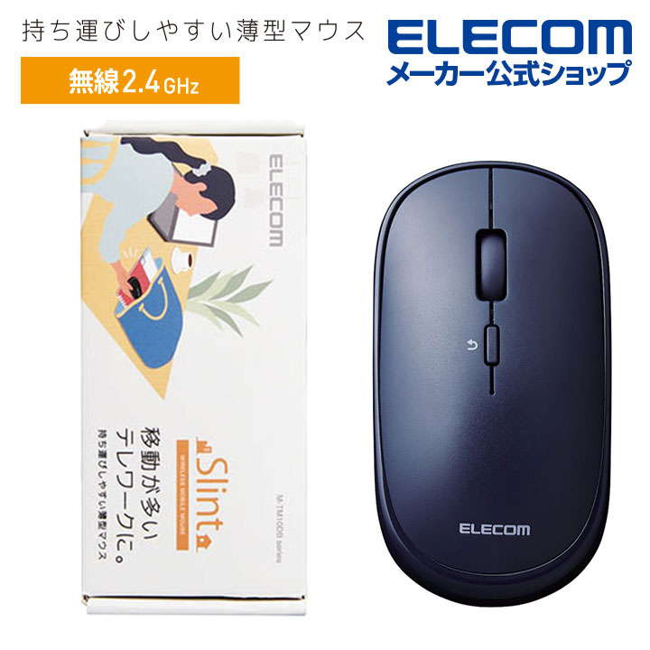 ■厚さ28mmの薄型設計でカバンに入れて持ち運びしやすい! 環境に配慮した簡易パッケージを採用。 ワイヤレスモバイルマウス“Slint(スリント)”。■カバンに入れて持ち運びしやすい厚み28mmの薄型マウスです。 ■環境に配慮し、ゴミを減らせて開梱作業もスムーズな簡易パッケージ仕様です。 ■小さな凹凸やホコリでもより正確に光が反射し、場所を選ばずに快適に使用できるBlueLEDを搭載しています。 ■ポインタの移動速度は800/1600カウントの2段階で切り替え可能です。 ■マウスのクリック時のカチカチ音がしない静音スイッチを採用し、音が気になる場所でも使えます。 ■ネットの閲覧などの操作に便利な「戻る」ボタンが付いた4ボタンタイプです。 ■無料でダウンロードできる「エレコムマウスアシスタント」を利用することで、各ボタンへの機能割り当てや、プレゼンテーションモードの使用ができます。 ■プレゼンテーションモードを有効にすると、通常のマウスモードと、スライド送り・戻しなどを操作できるプレゼンテーションモードとを切り替えて使用できます。プレゼンテーションモードでのボタンの詳細動作、スクロールやカーソル移動の無効などをカスタマイズ可能です。 ■2.4GHz帯を採用したワイヤレスタイプで、非磁性体で約10m、スチールデスクなど磁性体上でも約3mの範囲で使用可能です。(当社調べ) ■ノートパソコンのUSBポートに接続しても気にならず、装着したまま持ち運び可能な1円玉サイズのマイクロレシーバを採用しています。 ■レシーバはマウス本体内に収納可能なので、持ち運びに便利で、レシーバを紛失する心配を軽減します。 ■本体裏面に電源スイッチがあり、不使用時の電池の消耗を防止できます。 ■電池の交換時期をお知らせする電池残量表示ランプを搭載しています。 ■モバイルに最適な薄型設計のMサイズです。 ■左右対称で、右利き・左利きを問わず使いやすいシンメトリーデザインを採用しています。■インターフェイス:USB■コネクタ形状:USB(A)オス■対応OS:Windows 11、Windows 10、Windows 8.1、Windows7、macOS Catalina(10.15) ※各OSの最新バージョンへのアップデートや、サービスパックのインストールが必要になる場合があります。■分解能:800/1600カウント(切り替え可能)■通信方式:GFSK方式■電波周波数:2.4GHz帯■電波到達距離:磁性体(鉄の机など)の上で使用する場合:3m、非磁性体(木の机など)の上で使用する場合:10m ※当社環境でのテスト値であり保証値ではありません。■読取り方式:光学センサー方式■LED色:ブルー■ボタン数:4個 ※ホイールボタン含む■ホイール数:1個■レシーバ収納:〇■連続動作時間:約330時間■連続待機時間:約833日■想定電池使用期間:約628日 ※1日8時間のパソコン操作中5%をマウス操作に割り当てた場合■電源(本体):単3形アルカリ乾電池、単3形マンガン乾電池、単3形ニッケル水素電池のいずれか1本■カラー:ブルー■外形寸法(マウス本体):幅55.5mm×奥行103.8mm×高さ28.0mm■サイズ分類:Mサイズ■質量(マウス本体):約66g ※電池含む■外形寸法(レシーバ):約幅15.0×奥行き18.0×高さ6.0mm■質量(レシーバ):約2g■付属品:動作確認用単3形アルカリ乾電池×1■保証期間:6カ月エレコムダイレクトショップ