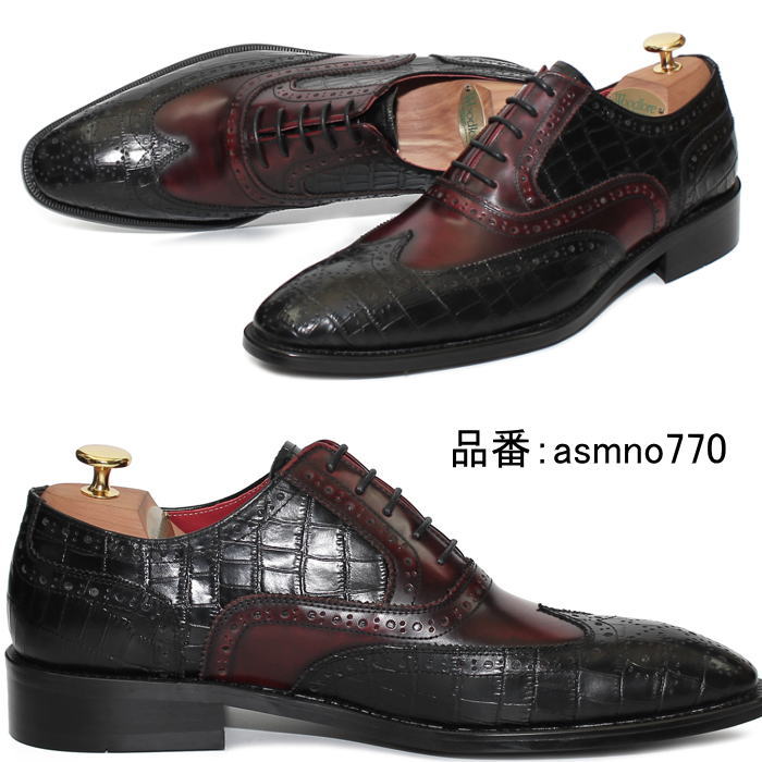 クロコ型押し レザーシューズ 異素材切り替えウィングチップシューズ メンズ レザーメンズシューズ ハンドメイド レザー 本革 靴