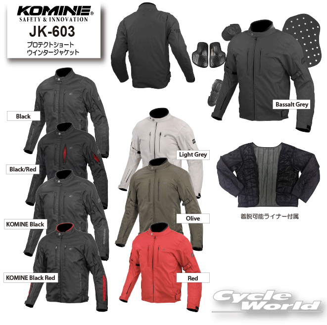 ◆JK-603 プロテクトショートウインタージャケット◆どんなバイクにもに合うシンプルなデザインのショート丈ウインタージャケット。着脱保温ライナーを装備。別売り電熱ライナーベスト(EK-101)をオプション装着可能。・透湿防水仕様・着脱保温ライナー付属・ジッパー式ベンチレーション・乗車姿勢をとりやすい立体パターン採用・ボリューム調整アジャスター・CE規格ハードプロテクター標準装備・EVAパッドを標準装備・ハードタイプ胸部プロテクター標準装備・夜間被視認性を高めるリフレクター・別売り一体型胸部プロテクター装着可能・別売りハードタイプバックプロテクター装着可能・別売り電熱ライニングベスト(EK-101)装着可能・偽造防止4Dラベル車種を選ばないシンプルなデザインのショート丈のライディングジャケット。専用の着脱式保温ライナーが付属し、電熱ライナーベスト(EK-101)の装着も可。一方で、腕・胸・背中にベンチレーションを装備した機能的な一着。■Size::XS・S・M・L・XL・2XL・3XL4XL・5XLB・6XLB(Black・Black/Red・Olive・Bassalt Grey only)■Color:Black・Olive・Black/Red・Red・Light Grey・Bassalt Grey・KOMINE Black・KOMINE Black Red■Material:[outshell] polyester [lining] polyester [warm lining] polyester■Protector:shoulder・elbow・back・chest-----------------------------------------------------------------------------------------------------※ブラウザやお使いのモニター環境により、掲載画像と実際の商品の色味が若干異なる場合があります。商品詳細画像は今シーズン展開外カラーを掲載していることがあります。掲載の価格・デザイン・仕様について、予告なく変更することがあります。あらかじめご了承ください。商品の詳細に関しましてはメーカーサイトをご確認頂ますようお願い致します。★送料・納期などの注意点につきましては必ず弊社会社概要ページの「ショップからの重要なご案内」をお読みいただき注文をお願いいたします。-----------------------------------------------------------------------------------------------------