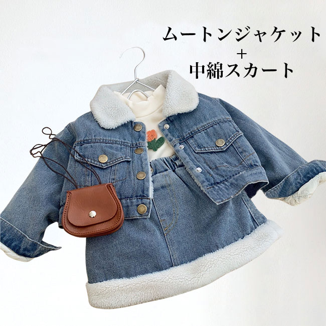 【送料無料】子供 デニムジャケット 裏ボア 女の子 ムートンジャケット デニムスカート 中綿 キッズ 上下2点セット 冬ジャケット 女児 裏ボアジャケット デニム 厚手スカート 綿入れ 冬 裏起毛ジャケット ジュニア 暖かい セットアップ ジージャン ムートン ブルー