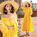 肩出し オフショルダー 五分袖 ワンピース オフショルダー 2WAY リゾートワンピ 夏ワンピ 大人かわいい 半袖 ゴムウエスト ロングワンピース マキシ丈 レディース ファッション フリル裾 着痩せ ビーチ 海デート 韓国 ホワイト イエロー dd215n1n1f4