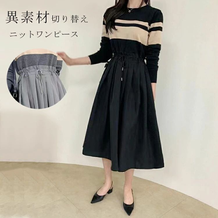 ウエスト ロングワンピース ボーダー 長袖 大きいサイズ 春 きれいめ ニットワンピ 冬 秋 ワンピース レディース 切り替え 秋冬