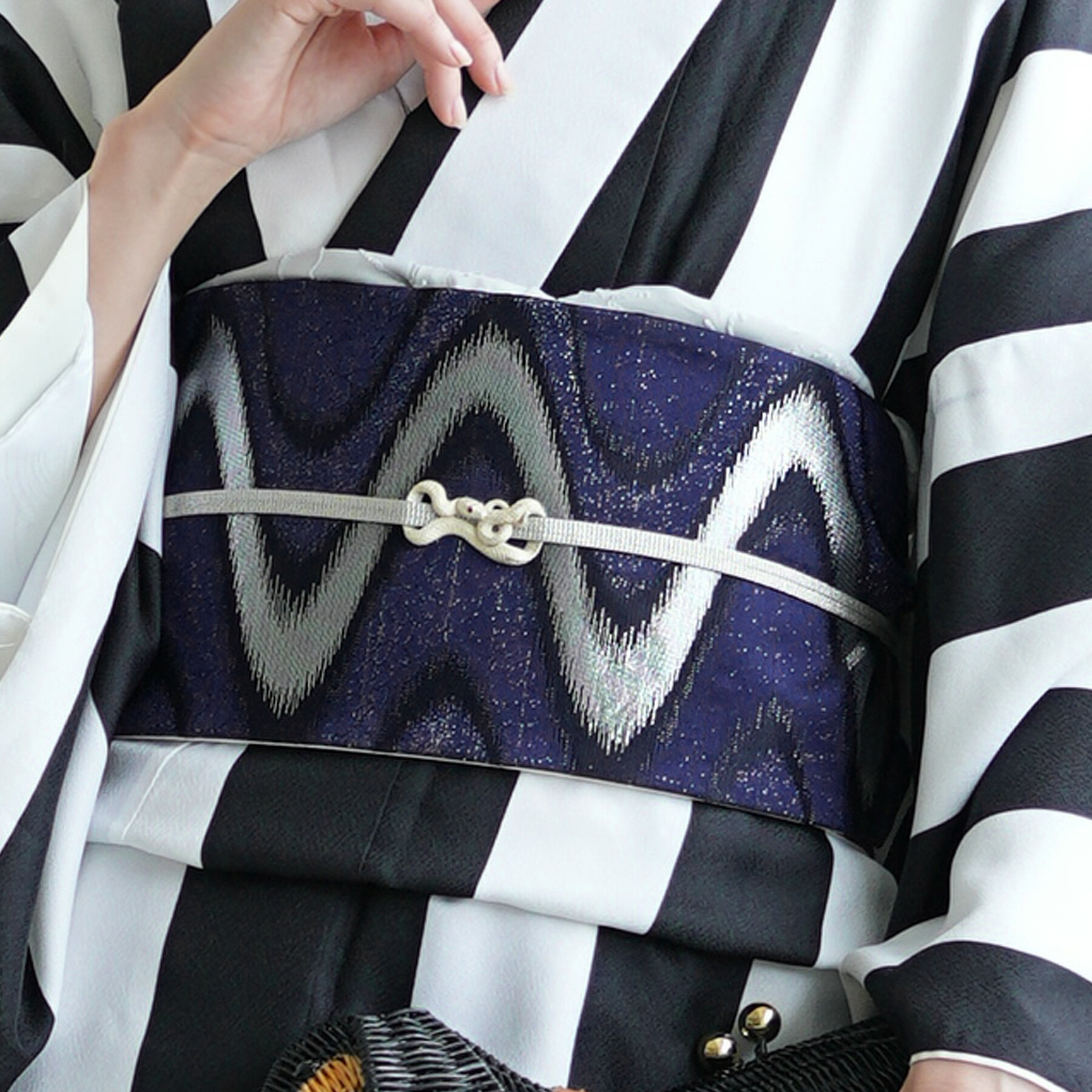 [商品画像について] ※商品画像はできる限り実物を再現するよう心掛けておりますが、お客様のモニターや閲覧環境によって大きく色味が異なる場合があります。 [商品在庫について] ※商品在庫は他店舗販売と共有しているため、更新のタイミングにより在庫切れの場合はやむをえずキャンセルさせていただく可能性があります。紫みを帯びた紺地に銀糸の流線のデザイン 角度によってキラキラと光る糸がとても印象的で 結び方によっては色々な表情を楽しんで頂けます。 金襴とは 色糸を使って織物を織る先染(さきぞめ)の紋織物の総称である「西陣織」のなかでも、 金糸や銀糸が使われる豪華な紋織物のことを「金襴」とよびます。 緯糸(よこいと)に金糸を織り込んで文様を表現する金襴。 金から糸を撚るわけではなく、和紙に金属箔を張り付けた、微細な短冊糸や、 糸に金属短冊糸を巻きつけた金銀糸が使われています。 柔軟性があるため、緯糸に金糸を使用しても経糸との絡みが良く、 よい柄や風合いが生まれます。 半幅帯仕立てなので 着物や浴衣などにもお気軽にお楽しみいただけます。 【セット内容】 帯 単品 ※上記以外は付属いたしません。 【素材】 ポリエステル100% 日本製 【適応サイズ】 フリーサイズ 【実寸サイズ】 幅 約17cm × 長さ 約400cm 【原産国】 日本
