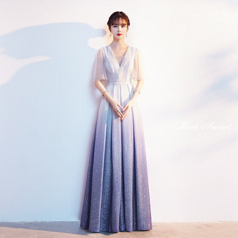 カラードレス ロングドレス ブルー フリル袖 青 半袖 演奏会ドレス 発表会 コンサート コンクール 舞台 コーラス 合唱衣装 大人 ステージドレス 大きいサイズ ウェディングドレス 結婚式 二次会 披露宴 ベルスリーブ グラデーションカラー フレア袖 パーティードレス