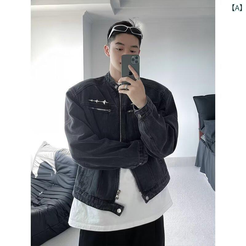 ジャケット メンズ アメリカンレトロ デニム アウター ウォッシュ加工 肩パッド ショート丈 切り替えデザイン ノーカラー メタリックデザイン 通気性 耐摩耗性 防風 吸湿速乾 ストリート カジュアル 普段使い ブラック ブルー