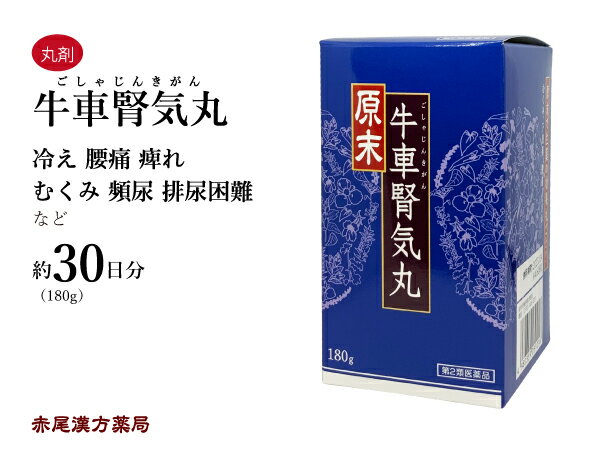 ▶ 900錠(約20日分)◀ ▶ 煎じ薬 10日分◀ ▶ お手軽煎じ薬 5日分◀ ▶ 2500錠(約55日分)◀ ▶ 煎じ薬 20日分◀ ▶ お手軽煎じ薬 10日分◀ 【漢方専門薬剤師からの注意点】 牛車腎気丸(ごしゃじんきがん)は下半身の老化や衰弱を補い、腎気を強める八味地黄丸に、痛みをとる牛膝(ゴシツ)と利尿作用のある車前子(シャゼンシ)を加えた漢方薬です。 腰痛や腰のだるさがひどく、冷え症で頻尿や排尿困難などがあるものに使用します。 他にも、似た症状に使用する漢方薬をまとめたページがございますので、画像をクリックしご覧ください。 原末・牛車腎気丸(ゲンマツ・ゴシャジンキガン)第2類医薬品 【製造元】株式会社ウチダ和漢薬 【効能・効果】 体力中等度以下で、疲れやすくて、四肢が冷えやすく尿量減少し、むくみがあり、ときに口渇があるものの次の諸症: 下肢痛、腰痛、しびれ、高齢者のかすみ目、かゆみ、排尿困難、頻尿、むくみ、高血圧に伴う随伴症状の改善(肩こり、頭重、耳鳴り) 【成分・分量】 1日量(60 丸)中 ジオウ 1.110g サンシュユ 0.555g サンヤク 0.555g タクシャ 0.416g ブクリョウ 0.416g ボタンピ 0.416g ケイヒ 0.139g ブシ 0.139g ゴシツ 0.416g シャゼンシ 0.416g 添加物としてハチミツ,寒梅粉,バレイショデンプンを含有する. 【用法・用量】 次の1回量を1日3回、食前または食間に服用する。 年 齢 1 回 量 成人(15 歳以上) 20 丸 15 歳未満7 歳以上 13 丸 7 歳未満4 歳以上 10 丸 4 歳未満3 歳以上 6 丸 3 歳未満 服用しないこと