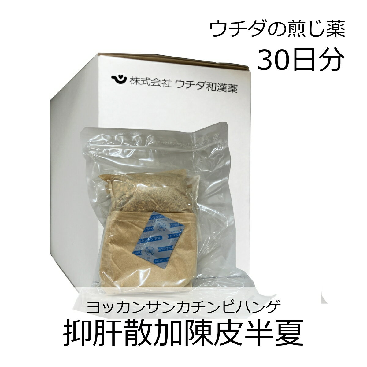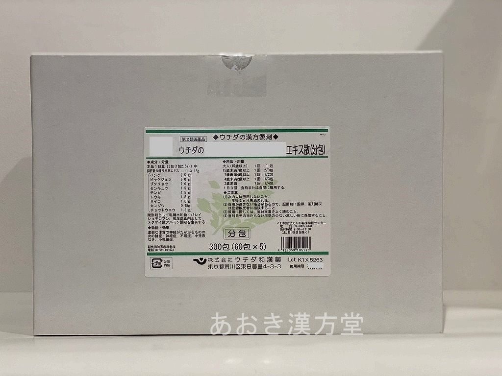 ウチダの抑肝散加陳皮半夏湯は漢方処方にしたがって,生薬を配合した煎じ薬で,特異な芳香があります。 【効能・効果】 虚弱な体質で神経がたかぶるものの次の諸症: 神経症,不眠症,小児夜なき,小児疳症 【用法・用量】 [年齢:1日量] 大人(15歳以上):1袋(1日分)につき水約600mLを加え,あまり強くない火にかけ約300mLに煮つめ,袋をとり出し3回に分けて食前1時間又は食間空腹時に温服する。 15歳未満7歳以上:大人の煎液の2/3量を3回に分けて食前1時間又は食間空腹時に温服する。 7歳未満4歳以上:大人の煎液の1/2量を3回に分けて食前1時間又は食間空腹時に温服する。 4歳未満2歳以上:大人の煎液の1/3量を3回に分けて食前1時間又は食間空腹時に温服する。 2歳未満:大人の煎液の1/4量以下を3回に分けて食前1時間又は食間空腹時に温服する。 <用法関連注意> (1)小児に服用させる場合には,保護者の指導監督のもとに服用させること。 (2)1歳未満の乳児には,医師の診療を受けさせることを優先し,止むを得ない場合にのみ服用させること。 【成分分量】 1袋(28.5g)中 トウキ 3g チョウトウコウ 3g センキュウ 3g チンピ 3g ハンゲ 5g ソウジュツ 4g ブクリョウ 4g サイコ 2g カンゾウ 1.5g <添加物> 無し 【使用上の注意】 ■してはいけないこと (守らないと現在の症状が悪化したり,副作用・事故が起こりやすくなる) 次の人は服用しないこと 生後3ヵ月未満の乳児。 ■相談すること 1.次の人は服用前に医師,薬剤師又は登録販売者に相談すること。 (1)医師の治療を受けている人。 (2)妊婦又は妊娠していると思われる人。 (3)胃腸の弱い人。 (4)高齢者。 (5)今までに薬等により発疹・発赤,かゆみ等を起こしたことがある人。 (6)次の症状のある人。 むくみ (7)次の診断を受けた人。 高血圧,心臓病,腎臓病 2.服用後,次の症状があらわれた場合は副作用の可能性があるので,直ちに服用を中止し,この文書を持って医師,薬剤師又は登録販売者に相談すること。 [関係部位:症状] 皮膚:発疹・発赤,かゆみ まれに下記の重篤な症状が起こることがある。その場合は直ちに医師の診療を受けること。 [症状の名称:症状] 偽アルドステロン症,ミオパチー:手足のだるさ,しびれ,つっぱり感やこわばりに加えて,脱力感,筋肉痛があらわれ,徐々に強くなる。 3.1ヵ月位(小児夜なきに服用する場合には1週間位)服用しても症状がよくならない場合は服用を中止し,この文書を持って医師,薬剤師又は登録販売者に相談すること。 4.長期連用する場合には,医師,薬剤師又は登録販売者に相談すること。 【保管及び取扱い上の注意】 (1)直射日光の当たらない湿気の少ない涼しい所に保管すること。 (2)小児の手の届かない所に保管すること。 (3)他の容器に入れ替えないこと。(誤用の原因になったり品質が変わる。) 【お問い合わせ】 会社名:株式会社ウチダ和漢薬 お客様相談センター 電話:03-3806-4141 受付時間:9:00~17:30(土,日,祝日を除く)商品名: ウチダの抑肝散加陳皮半夏湯 製造元:株式会社ウチダ和漢薬 販売元:株式会社ウチダ和漢薬 生産国:日本 商品区分:第2類医薬品 広告文責:有限会社新薬堂薬局 薬剤師:安藤晋也 連絡先:047-323-6860(電話受付:月~土 AM9:00-PM6:00) 当店で販売する医薬品は、特に記述がない限り、使用期限が最短でも10ヶ月以上のものを販売しております。(※使用期限が製造より最長1年未満の医薬品については例外といたします。) ◎使用上の注意をよく読んだ上でそれに従い適切に使用してください 「医薬品販売に関する記載事項」はこちら