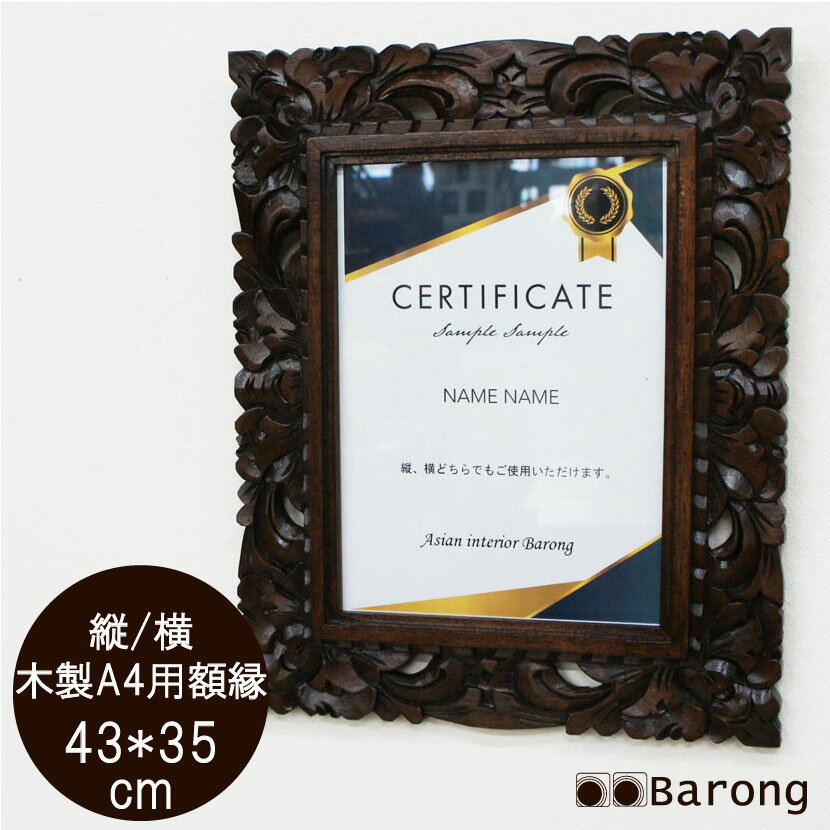 【送料無料!】アジアンA4用額 透明シート付 木製彫刻 43×35cm / 賞状額 アジアン額 アジアンフレーム 額 ポスター ウッドカービング 賞状フレーム A4フレーム A4額 アジアンインテリア アジアン雑貨 バリ雑貨 サロン 壁飾り 壁掛け 木製彫刻 ハンドメイド エスニック