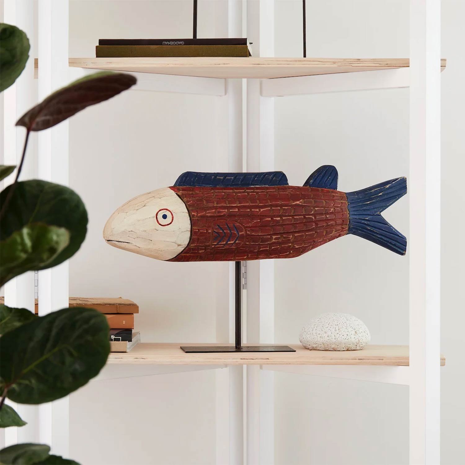 お買い物ガイド スペインのバテラ社によるフレンチヴィンテージスタイルなウッドカービングの魚オブジェ。こちらはラージサイズ。アフリカの工芸品を思わせる鮮やかな色合いとラフな彫りが存在感抜群。シャービーな鉄のスタンドが付属しますので、スタンドの先端に魚を差し込んで飾ります。全て職人による手作業で仕上げているため個体差があります。 サイズ本体 / 約 幅45.0 × 高さ25.0 × 奥行9.0 (cm)魚本体 / 約 幅45. 0 × 高さ12.0 × 奥行9.0 (cm) 素材木、金属 生産スペイン パッケージ紙箱入り 【注意事項】 ・全て職人による手作業で仕上げている為、サイズ・形状・色・表情等に個体差がございます。予めご了承の上お買い求めください。 ・魚本体の色にムラ・擦れ・若干の欠け、鉄製のスタンドに錆びがございます。予めご了承ください。 ・海外からの輸入製品のため、パッケージに若干の汚れや凹みなどがある場合がございます。