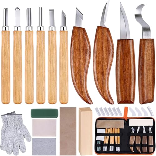 カービングナイフ セット 26本セット 木彫り キット 初心者 DIY工具 収納袋付き 伝統工芸 木工ナイフ 手袋付きウッドカービング【アップグレード版 初心者向け木彫りセット】- 26点セットの木彫りツールで、彫刻を始めるために必要なものがすべて揃っています。この木彫りセットにはフックカービングナイフ、ディテール木彫りナイフ、木削りナイフ、斜刃ナイフ、6本の炭素鋼彫刻鑿ナイフ、9個の刃プロテクター、切断防止手袋、木彫り用ブランク1個、レザーストロップ1枚、研磨コンパウンド1個、フォステッドスポンジ2枚、収納バッグ1個が含まれます。【人間工学デザインハンドル】- カービングナイフのハンドルは高級ブラックウォールナット材を使用し、滑らかで握り心地が良く、安定性と耐久性を兼ね備えています。人間工学に基づいたハンドルデザインにより、長時間の彫刻作業でも快適な使い心地を実現。手の疲れを軽減し、創作活動に集中できる仕様です。【切断防止手袋】- 特殊高密度ポリエチレン繊維と弾性素材を組み合わせた手袋で、刃物による切り傷や擦り傷から手を保護。柔軟な操作性を実現し、硬すぎず滑らない設計で、彫刻作業中の安全性と快適性を両立。道具を確実に握りながら安全に作業可能です。【幅広い活用シーン】-- 初心者に最適な贈り物として、この彫刻ナイフセットはハロウィンかぼちゃ彫刻、木彫り、DIYカット、研磨など多様な用途に使用可能。さらに、安全で簡単な滑石工芸、手作りクラフト、粘土彫塑、木製壁面装飾、彫刻作品制作など、アート創作全般に対応。クリエイターの想像力を形にする理想的なツールキットです。【ホリデーギフトに最適】-- 彫刻愛好家や初心者、お子様へ贈る木彫りツールセット。プロユースにも耐える本格仕様ながら、母の日・父の日・バレンタイン・友人への贈り物としても人気。家族や大切な人と共有する木工芸の楽しさを、この道具箱がクリエイティブな体験へと導きます。初心者から熟練者まで、あらゆるレベルの創作活動をサポートする一生モノの贈り物です。