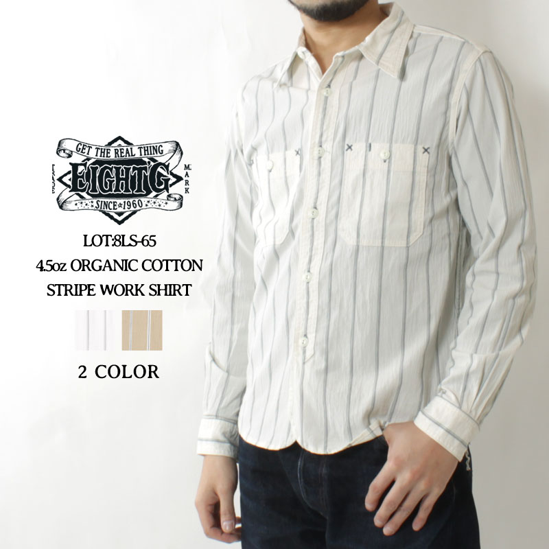 【16日23:59まで!エントリーでP最大5倍】 エイトジー ワークシャツ ストライプ 2023春夏 新作 日本製 国産 長袖 ワッシャー加工 オーガニックコットン 薄手 羽織り ホワイト ブラウン 春物 爽やか おしゃれ 大人 EIGHT-G 4.5oz ORGANIC COTTON STRIPE WORK SHIRT 8LS-65