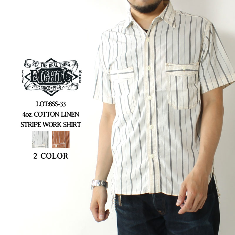 【16日23:59まで!エントリーでP最大5倍】 エイトジー 2022春夏 新作 ワークシャツ 半袖 メンズ 日本製 綿麻 コットンリネン ストライプシャツ ヴィンテージ 国産 おしゃれ 大人 アメカジ ブランド EIGHT-G 4oz COTTON LINEN STRIPE WORK SHIRT 8SS-33