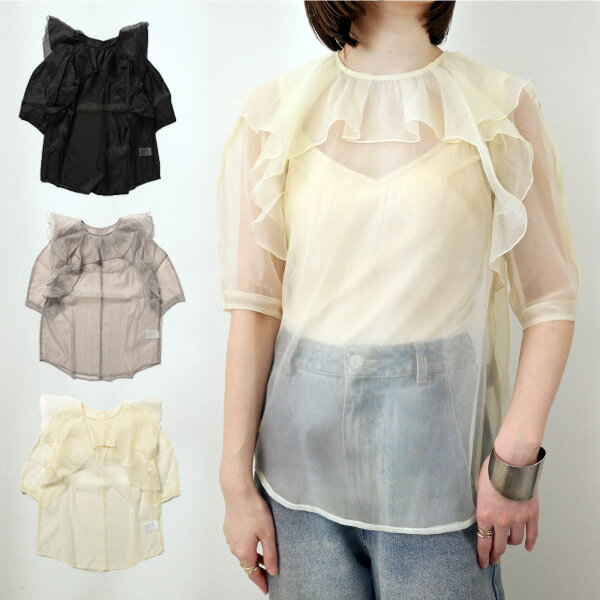 【取り寄せ対応】シャツ ブラウス オーガンジー 半袖 5分袖 フリル 透けトップス 黒 無地 トップス レディース エクリュ グレー ブラック