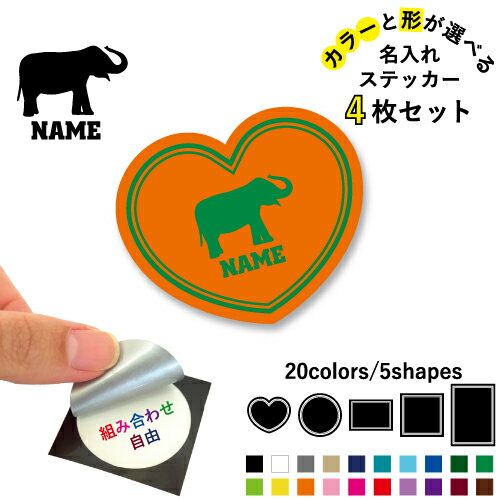 ゾウ 名入れ文字入れステッカー4枚セット 色と形が選べる シール 多目的ステッカー UVカット 円 ハート 正方形 長方形 スマホステッカー スマホケース 挟む シースルーシール 見せる 貼らない スマホ裏 エレファント、象、elephant