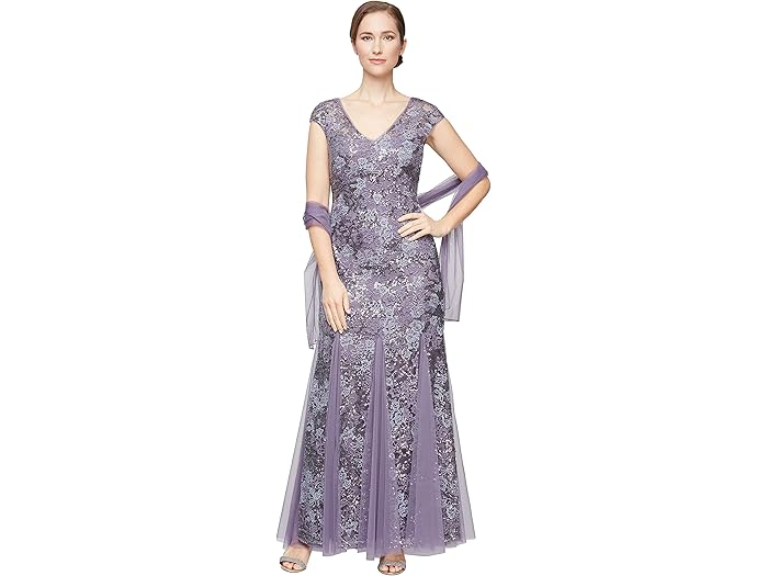 (取寄) アレックス イブニングス レディース ロング エンブロイダー フィットアンドフレア ドレス ウィズ ゴデット ディテール スカート アンド ショール Alex Evenings women Long Embroidered Fit-and-Flare Dress with Godet Detail Skirt and Shawl Icy Orchid