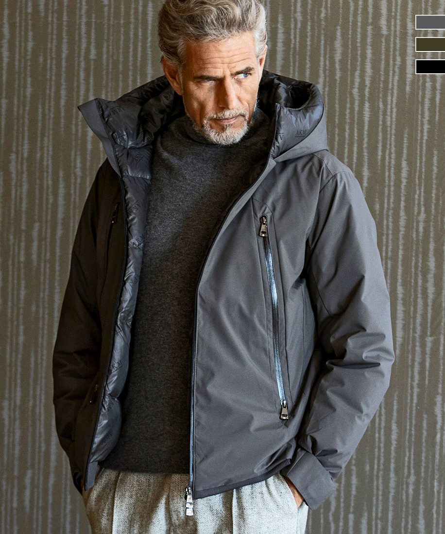 【再販決定!】昨シーズン大ヒット完売のAKMダウンジャケットが再登場!リブのスタンドネック付インナーがレイヤードされた、フード付きダウンジャケット。落ち着きのあるマットな質感のナイロン生地ボディは、Tシャツ&デニムのカジュアルスタイルからジャケットのアウターまで、スタイルを問わずコーディネートに取り入れられる頼もしい着回し力を備えています。シルエットはダウン特有の着膨れ感や重さを排除したやや細身めな仕上がりですが、部分的にストレッチ性に優れた生地を使用することで運動性&着心地の良さがしっかりと確保されています◎ディテールのポイントはブランドオリジナルのファスナー引手に配されたキラリと輝くクリスタルと、フード裏や身頃裏にさり気なくデザインされたカモフラージュ柄。随所に使用されているAKMならではの拘りや上質素材が、シンプルながらもどこか遊び心と高級感を湛えた、渾身の逸品です◎【機能】<防水・透湿機能中透明フィルム加工>湿気や水分を含むと乾燥時の約40%程度まで保温性能が低下してしまうダウン。そんな水分に弱いダウンを守るため、表地の下に機能性フィルムを仕込みました。防水・透湿機能を持ったフィルムが衣服内のムレを軽減し、急な雨にも安心な設計です。◆透湿性:3000g/m2*24hr以上◆耐水圧:10000mmH2O以上[型番:ASO-829]----------------------------------------------------------------------------【 AKM エイケイエム 】最高の贅沢を知る男の「至高のリアルクローズ」 目指すのは国内ラグジュアリーウエアのパイオニア。 妥協することなく厳選された素材と美しさを追求した独自のシルエットパターンが作り出す作品の数々は、知性漂う魅惑の香りと暇を楽しむ艶のある男に華を咲かせる。 着て初めてわかるその力強さと存在感、美しさ、上質感から多くのファッショニスタや著名人から圧倒的な支持を受けている。■カラー:khaki、navy、blackS 約(着丈65 肩幅45 身幅51.5 袖丈64)cmM 約(着丈67 肩幅47 身幅53.5 袖丈65)cmL 約(着丈69 肩幅48 身幅55.5 袖丈66)cmXL約(着丈72 肩幅49 身幅57.5 袖丈67)cmXXL約(着丈76 肩幅50 身幅59.5 袖丈68)cmMODEL H184 C94 W79 H96 着用サイズ:M※( )で表記されている数字はヌードサイズです。ヌードサイズとは衣服を身につけない身体のサイズです。お客様ご自身の身体サイズと比較してお選びください。 ■素材: 表地:ナイロン100%中:ダウン80%、フェザー20%裏地:ポリエステル100% ■お手入: ドライ >>商品のお取り扱い方法 ■原産国: 中国製【直営店・WEB限定】AKM Contemporary ダウンジャケット/エイケイエム コンテンポラリー(AKMContemporary)khakinavyblack画面上と実物では、多少色具合が異なって見える場合がございます。