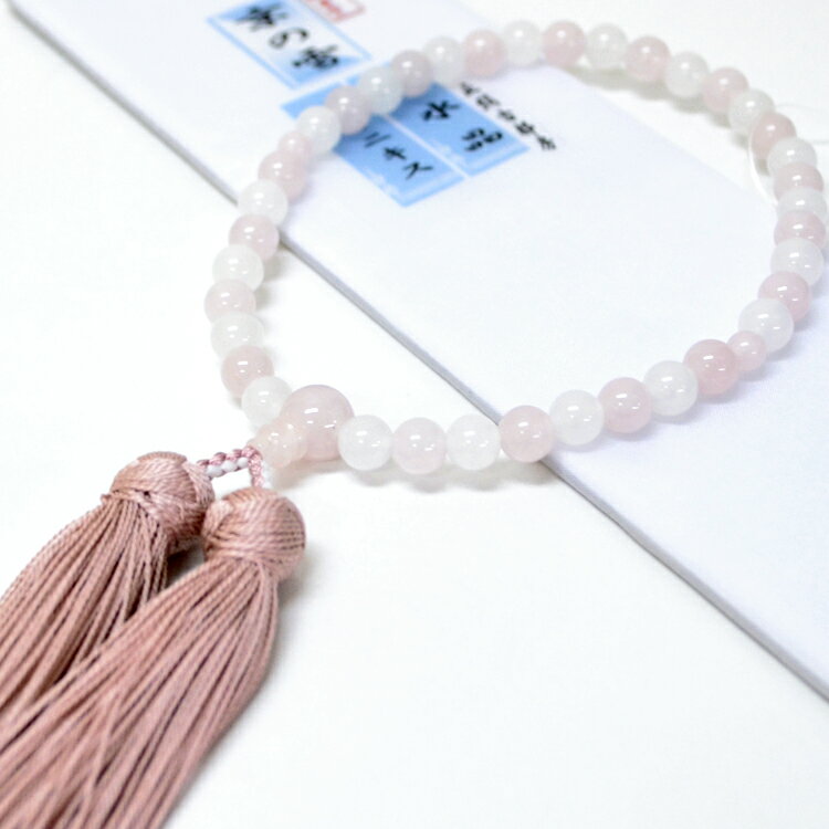 一番身近な仏具は数珠です。数珠は、本来108個の「主珠」で構成されています。 人間には百八の煩悩(ぼんのう)があると言われていますが、 珠のひとつひとつに百八の煩悩を司る仏様がいると言われています。 中心になる「親珠」は、大きさが一番大きく、 阿弥陀仏如来、あるいは釈迦如来を象徴しています。 天珠(てんだま)は、主珠の間にある小さな玉で、 本来は四天王や四菩薩を象徴しています。 このように、数珠の珠ひとつひとつに意味があります。 正式な数珠は、108の珠を繋いで作られますが、一般的には略式念珠が多く使われます。どの宗派でもお使いいただける一重のお数珠です。 女性用片手略式念珠「京の雪白オニキス・紅水晶」古都房・灰桜 桐箱入り 乳白色の白オニキスと紅水晶を交互に並べて仕立てた女性用の略式念珠です。略式念珠は宗派を問いませんので、1つ持っていればいざと言う時に慌てることもなくなります。突然の知らせで礼服が間に合わない!そんな方でも、派手な服装でなければ数珠があれば大丈夫です。 素材 白オニキス・紅水晶 ホワイトオニキスは、「オニキス」の名が付いていますが、 そのイメージとは正反対の純白カラーの石です。 ホワイトオニキスはオニキスと同じく 魔除け・厄除けの意味があると伝えられています。 邪念や悪運などの、ネガティブなエネルギーを祓ってくれると言われています。 また純白のホワイトカラーが、雑念を祓うとも言われています。 柔らかな印象を持つ紅水晶〔ローズクォーツ〕は、女性からの絶大なる人気を博している石のひとつです。愛と優しさの象徴とされ、女性の内なる美しさを輝かせてくれる石です。自分に対するマイナスな感情を優しくなだめてくれる癒しの石でもあります。 珠サイズ 親玉/約10mm・紅水晶 主珠/8mm・白オニキス・紅水晶 二天珠/約5mm・紅水晶 房 素材/正絹 カラー/灰桜 形/古都房 ※庵心堂では、まず商品を手にとって、品質を確認し、独自に撮影をしております。撮影時の光の具合やブラウザーの環境などにより、画像と商品の色に若干の違いが生じる場合がございます。ご了承ください。 ※念珠入れのカラーにチェックを忘れずにお願い致します。 ※納期の時間がかかる場合は、個別にご連絡させていただきます。乳白色の白オニキスと紅水晶を交互に並べて仕立てた女性用の略式念珠です。 淡い色の組み合わせはとてもかわいらしく、若い方がはじめての念珠としてお持ちいただくのに最適です。 房は、正絹房です。