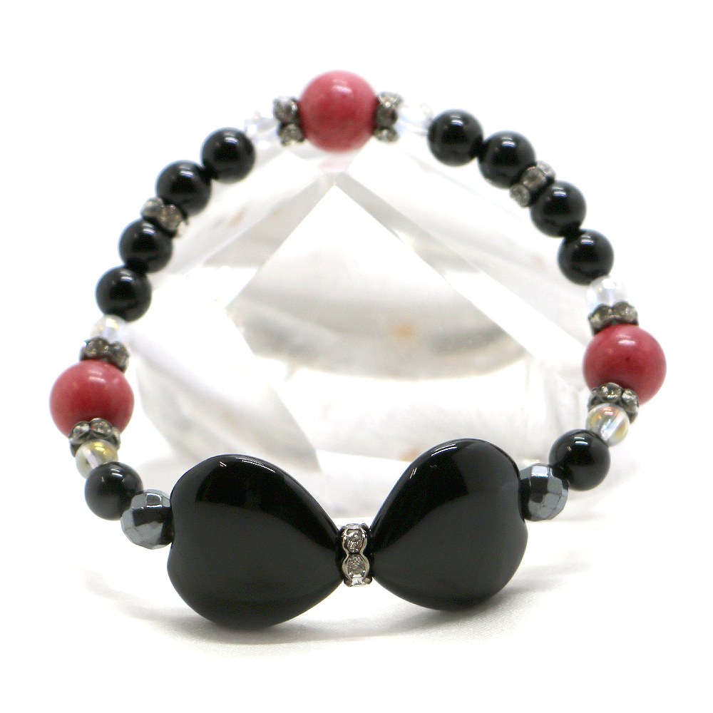 ◆玉サイズ(約) オニキスハート:18mm ピーモンタイト:8mm オニキス6mm ヘマタイト:6mmカット アクアオーラ:4mm ロンデル:ガンメタリック×クリア波型:6mm5mm ◆腕回りサイズは約14.5cmとなります。 ふたつのハートが重なったリボンモチーフのオリジナルデザインブレスレットです。 恋人、夫婦の絆の深め、幸福をもたらすといわれています。魔除けのお守りとして。 【配送につきまして】 ●メール便:送料250円(お買い物合計金額3,000円以上で1通分送料無料) ・ヤマト運輸ネコポスでのお届けとなります ・宅配便同様のお届け日数(翌日〜3日程度での配達)*一部地域を除く ・ご自宅のポストへのお届けとなります(ご登録のお名前がポストへ記載があることをご確認お願い致します) ・大きさ(上限A4サイズ):縦31.2cm、横22.8cm、厚さ2.5cm、重さ1kg以内 ※後払い(商品到着後コンビニなどでのお支払い)はご利用頂けます ※代引き決済はできません ※配送日時指定不可 ※発送後の住所変更はできませんので予めご注意ください ※商品紛失などの補償は基本的にございません ●宅配便:送料は配達地域によって異なります(お買い物合計金額3,980円以上で送料無料) ・佐川急便でのお届けとなります ・ドライバーによる手渡しでのお届け ・代引き決済はドライバーへ代金のお支払が可能となります (代引き手数料330円) ・配送日時指定可能 ※初回お届けより1週間以上お受け取りになられない場合は持ち戻りとなり返送となります 返送による送料は運送会社の定価送料を実費ご負担いただくことになりますので 予めご注意くださいますようお願い申し上げます ※当店の判断で日本郵便(レターパック)で発送させていただく場合もございます 予めご了承のほどお願い申し上げます