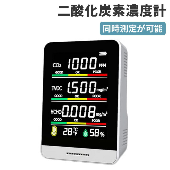 【5つのデータを同時測定】CO2/TVOC/HCHO/温度/湿度のデータを同時に測定できます。デジタルディスプレイに二酸化炭素(CO2)とホルムアルデヒド濃度を色と数値で表示し、同時に湿度や温度をリアルタイムで表示することができます。 【高性能センサー内蔵】NDIRセンサーを採用し、対象ガスに応じて固有の赤外線のエネルギー(波長)で赤外線が吸収されることから、ガス選択性が非常に高く、高精度なCO2測定を実現しました。CO2硬度は人の動きに連動して常に大きく変動を起こります。1秒毎に計測することで、比較的に安定した測定値を得ることができます。 【リアルタイム監視】二酸化炭素検出器は室内の空気汚れ、人体に悪影響を及ぼす化学物質や無色無臭な二酸化炭素の有無を検知し、1秒ごとにリアルタイムで更新します。デジタルディスプレイのカラーと数値を通して、現在の空気の質のレベルを確認できます。【幅広い用途】農業植栽、温室野菜、生産倉庫、原材料加工、インテリア(家庭内、保育室、病棟、車、オフィスなどの閉鎖環境)など、さまざまな場面に幅広く適用できます。この空気検知器を設置して、いつでも空気の質をチェックし、家族の健康を守ることができます。 アラームは常にビープ音ですが、音をオフにしたい場合は電源ボタンを2回クリックして音をオフにすることができます。【基本仕様 】寸法:約 100×70×35 mm 重量:約 136 g バッテリー:1200 mA 入力:5V 1000mA 【付属品】取扱説明書、USBケーブル