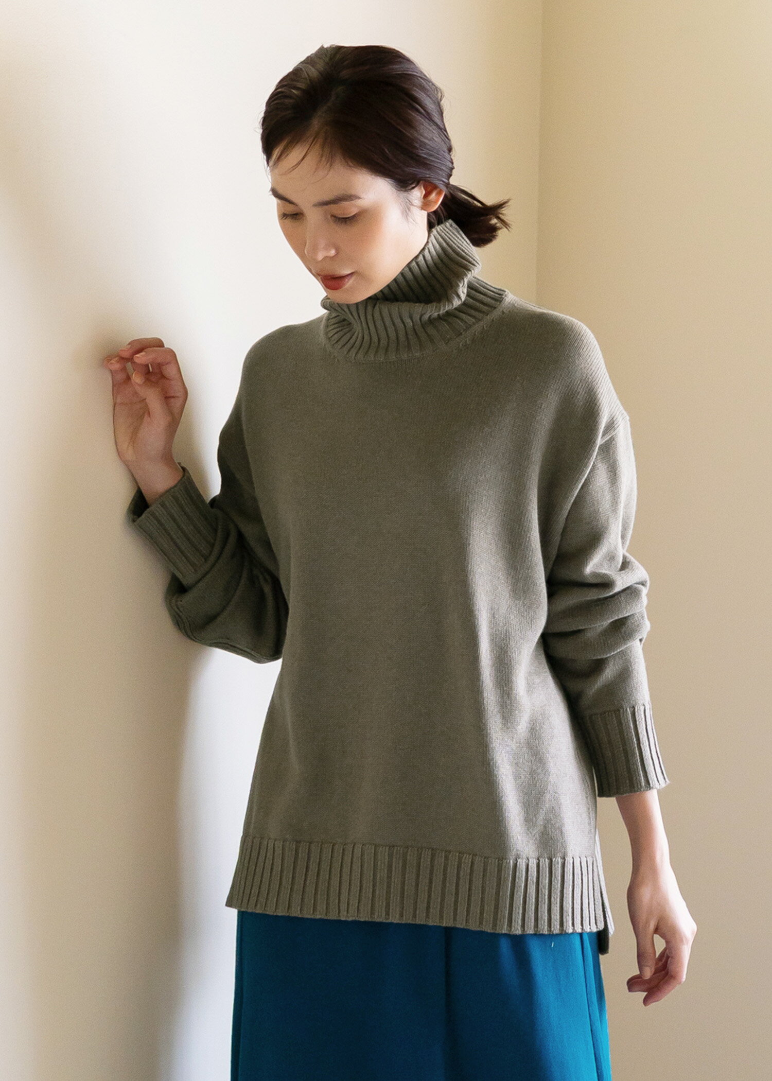 オーガニックコットンのタートルネックニットです。ウールがチクチクしてしまう方にもおすすめです。前後で丈の長さが異なる、サイドにスリットが入ったデザイン。ゆったりボクシーなデザインです。襟、袖口、裾部分のボリューム感のあるワイドリブがアクセント。襟を折らずにそのままクシュクシュさせても、折って二重にしてもOK。カジュアルなパンツからフェミニンなスカートまで幅広くコーディネートできます。【エシカルポイント】 オーガニックコットンを使用することは、働く人の健康と自然環境を守ることができる持続可能なものづくりです。この商品は、オーガニック・テキスタイル世界基準(GOTS)認証を取得しています。原材料がオーガニックであるだけでなく、生地の生産・加工・保管・流通のすべての過程で環境的・社会的な厳しい基準を満たしています。●オーガニックコットン100%/ラジラクシミ/インドより※画像は、撮影時の光の当たり具合や、パソコン・スマートフォンの環境により、実際の色味と違って見える場合があります。M:身丈約64 バスト約114 裄丈約75cmL:身丈約66 バスト約120 裄丈約77cm※ラッピングをご希望の方は こちら よりラッピングサービス(税込576円)をご追加ください。