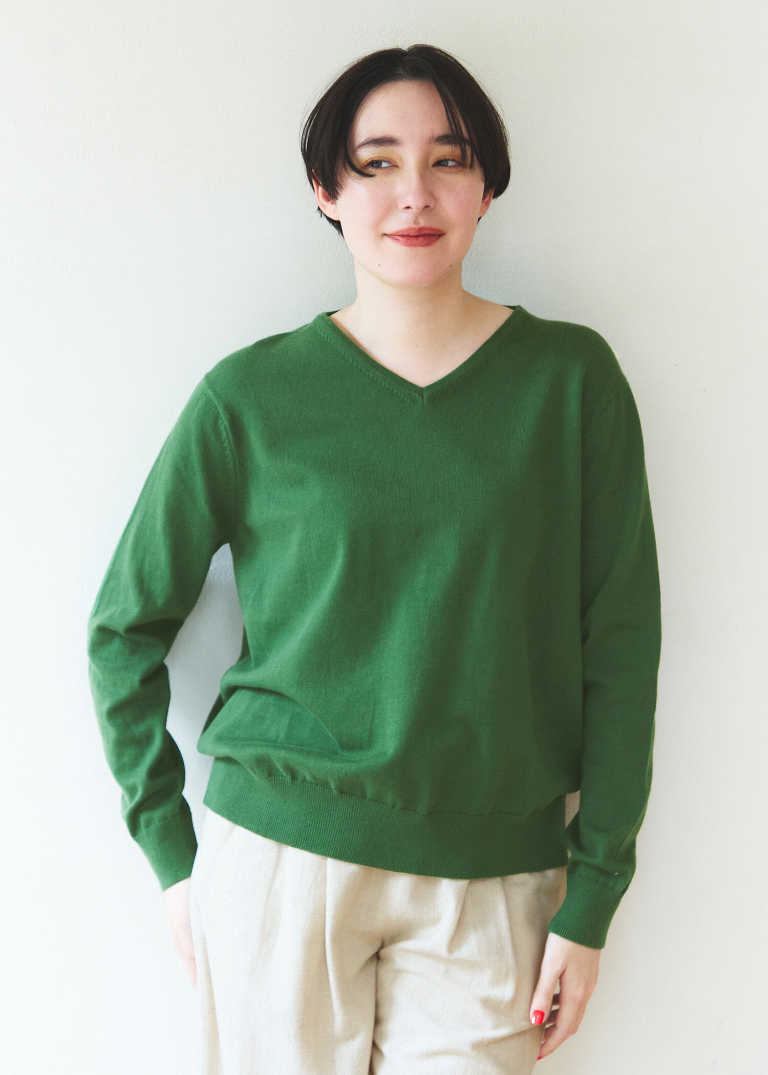 これまでの定番ニットアイテムよりも細い糸を使って、軽やかに仕上げました。ベーシックで着まわしがきくシリーズ。メランジの入った生成り、やさしい色合いのピンク、きかせ色になるハッキリしたグリーンの3色を揃えました。浅めのVネックで、やや横に広いゆったりめのサイズ感のニットです。パンツにもスカートにも合わせやすく、きちんとした印象にもカジュアルにも着こなせます。【エシカルポイント】 オーガニックコットンを使用することは、働く人の健康と自然環境を守ることができる持続可能なものづくりです。この商品は、オーガニック・テキスタイル世界基準(GOTS)認証を取得しています。原材料がオーガニックであるだけでなく、生地の生産・加工・保管・流通のすべての過程で環境的・社会的な厳しい基準を満たしています。●オーガニックコットン100%/ラジラクシミ/インドより M:バスト116 肩幅42 袖丈56 身丈62cm L:バスト122 肩幅43 袖丈57 身丈64cmモデル身長:170cm 着用サイズ:M/詳細画像身長:166cm 着用サイズ:M ※画像は、撮影時の光の当たり具合や、パソコン・スマートフォンの環境により、実際の色味と違って見える場合があります。※ラッピングをご希望の方は こちら よりラッピングサービス(税込557円)をご追加ください。